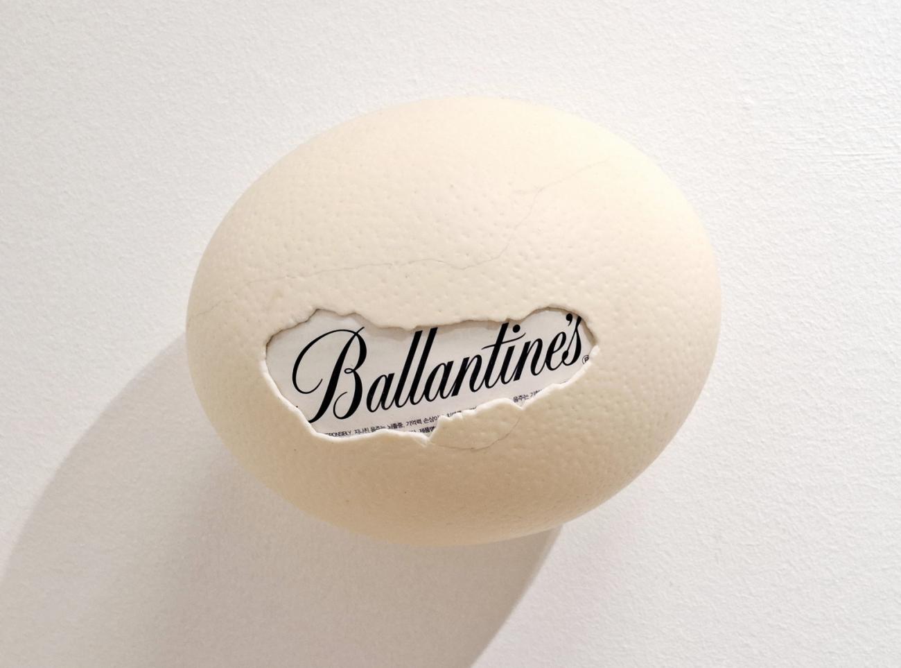 Ostrich egg, Ballantines, 2025, Straußeneierschale, gefundene Verpackung, Mischtechnik