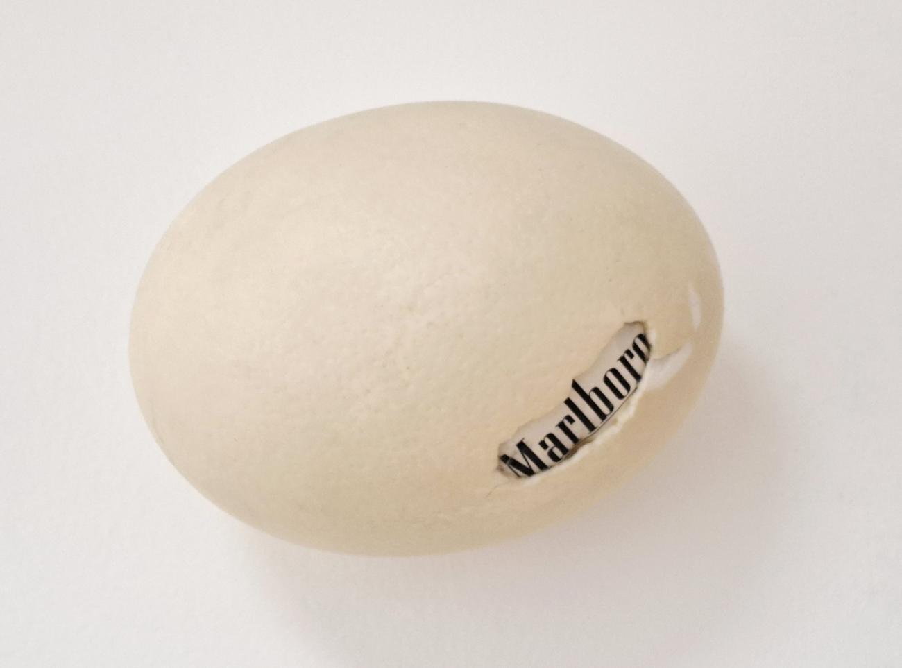 Ostrich egg, Marlboro, 2025, Straußeneierschale, gefundene Verpackung, Mischtechnik
